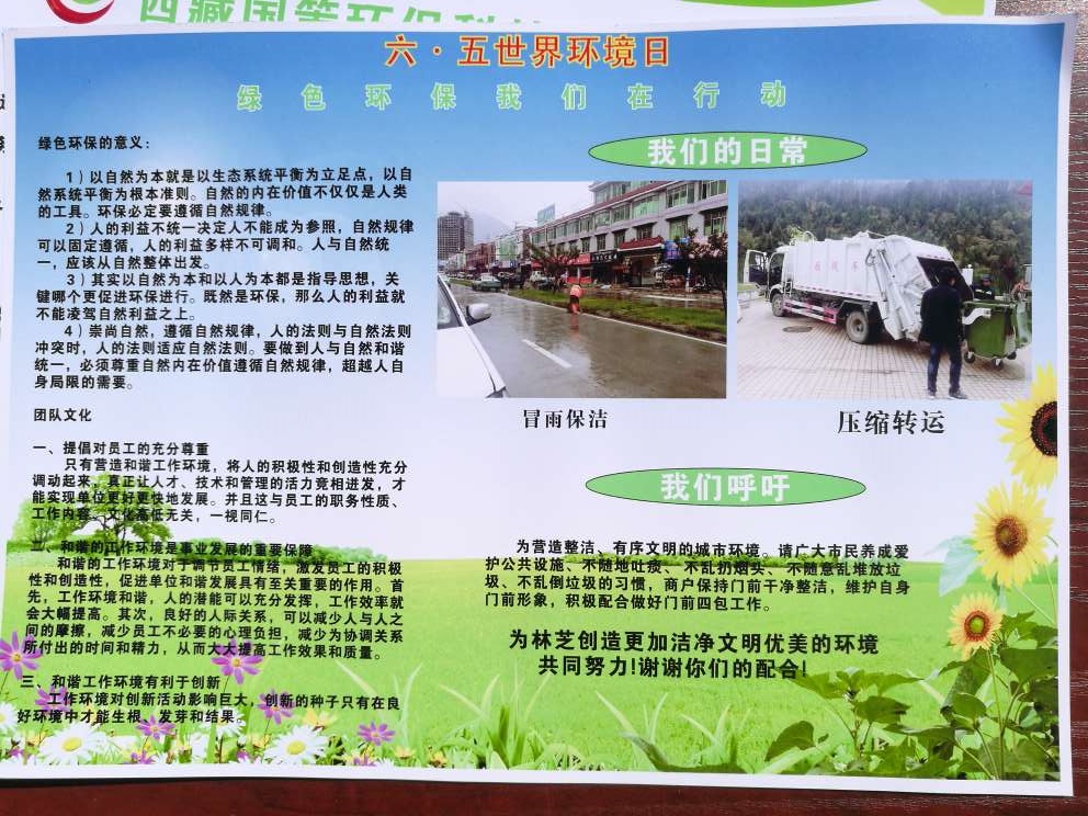 2017年6月5日,在林芝市巴宜區(qū)廈門廣場開展《六五世界環(huán)境日》環(huán)保宣傳活動,——“青山綠水便是金山銀山”,呼吁廣大市民、游客等廣大群眾參與保護雪域高原最后的碧水藍天;此次活動由林芝市環(huán)保局牽頭組織舉辦,參與活動單位:林芝市市政管理局、西藏國策環(huán)保科技股份有限公司林芝分公司、林芝市農(nóng)牧局、林芝市國土資源局、林芝市發(fā)改委、中國華能、巴宜區(qū)環(huán)保局、林芝市商務局、林芝市科技局、林芝市林業(yè)局等單位?;顒蝇F(xiàn)場也聚集市民、游客等參與環(huán)保宣傳和學習環(huán)保知識。